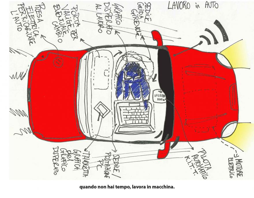 In un mondo frenetico, in cui spesso è necessario stare in più posti contemporaneamente, un grafico ha bisogno di lavorare mentre si muove. E le nuove tecnologie gli permetteranno di farlo, costruendo per lui una auto-studio, con il guidatore automatico, un sedile che diventa scrivania e tutto l'occorrente per poter disegnare il nuovo layout del nuovo sito web a cui stai lavorando in tempo al cliente.