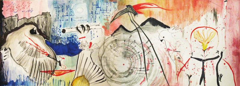[dimensioni 52x142 cm, supporto ligneo | tecnica mista: pennarelli colla pastelli a olio]