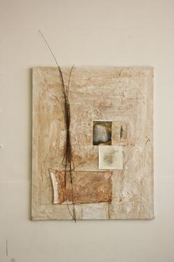 acrilico, gesso, carta, rami secchi, foglie, stoffa e foto su tela, cm 100x80