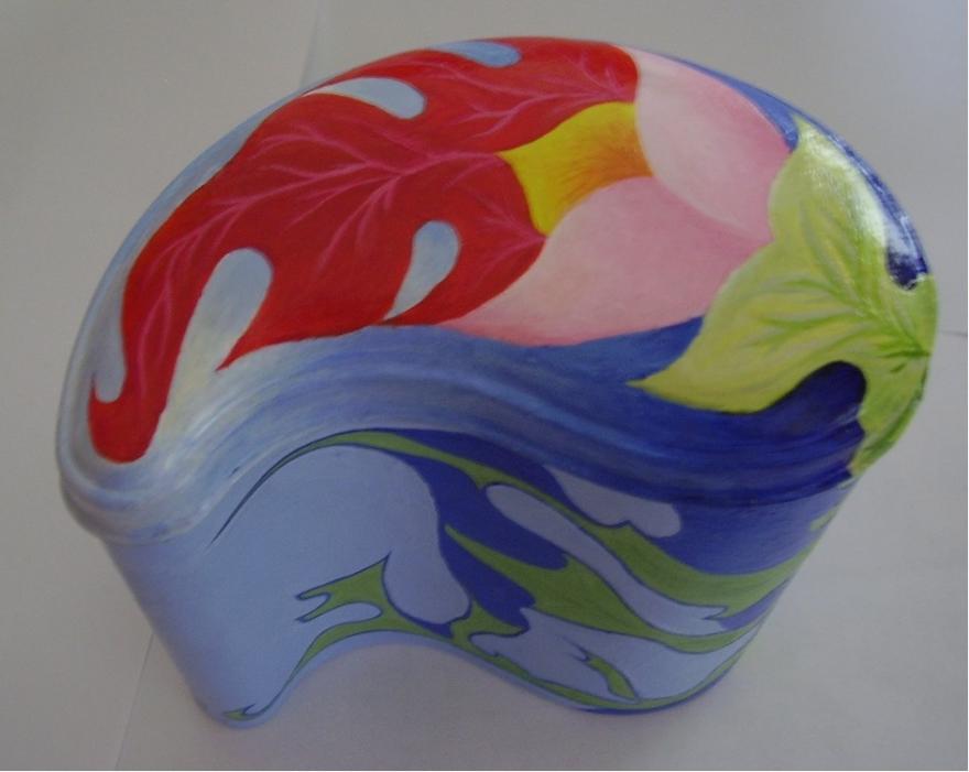 Il progetto prende vita da un oggetto da me scelto, ovvero una scatola in latta di una famosa marca di cioccolatini dalla curiosa forma a goccia. Da questa particolare forma ne avevo ricavato un fiore “fiammeggiante” sul coperchio, che continuava con il fusto sulle pareti della scatola con foglie anch’esse “fiammeggianti”.