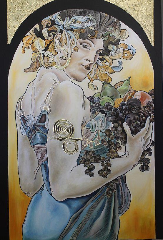 Dimensioni: 80x120 materiale e tecnica: acrlico su tela con foglia d'oro in rilievo . L'opera riproduce i caratteri artistici del periodo artistico del '900 ovvero del Liberty ma soprattutto riproduce l'opera "Fruit" dell'artista ceco Alphonse Mucha, aggiungendo però l'utilizzo della foglia d'oro.