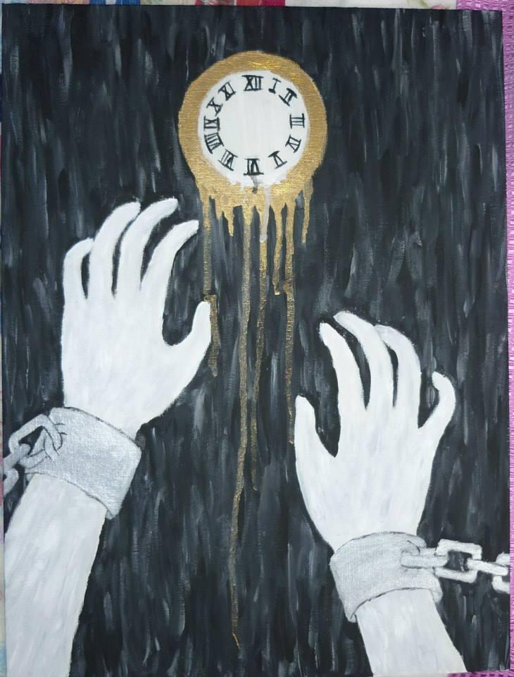 Incatenata al passato - nessun futuroAcrilico su cartone telato. Misura: 30x40 cmQuesto quadro rappresenta un po' la mia situazione attuale e anche dei giovani della mia età, ovvero una situazione di stallo. Abbiamo nostalgia del passato, vogliamo tornare a vivere in modo spensierato, aggrappandoci ai ricordi felici. Allo stesso tempo vogliamo di affermarci nella vita, di emanciparci trovando lavoro, anche se ormai rimangono poche speranze per il futuro.Il quadro rappresenta anche nostalgia per i bei tempi passati, che impedisce di guardare al futuro, mentre il presente ci sfugge.