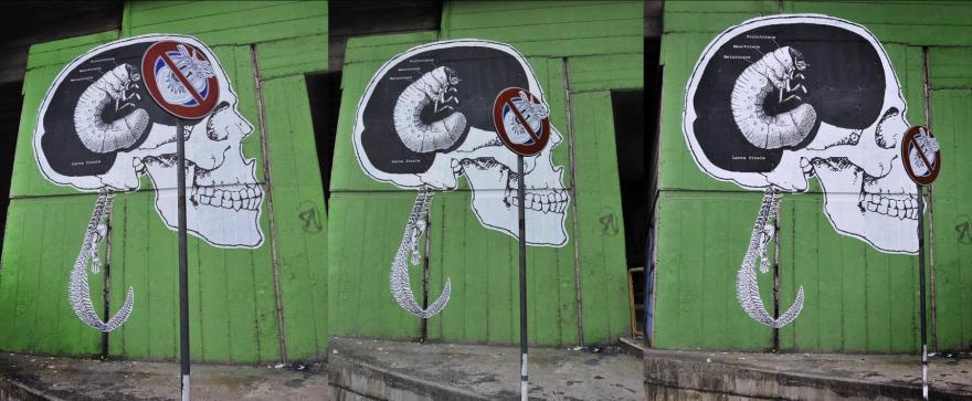 CON UNA LARVA DI COLEOTTERO AL POSTO DEL CERVELLO, ED IL CUORE SU UN CARTELLO STRADALE. LARVA FINALE INTERVENTO DI STREET ART: 2X4 m 8 m2 DI STAMPA DIGITALE 6 LITRI DI COLLA DA PARATI.